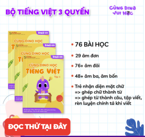 Có lá»™ trình há»Âc vàcam kết đầu ra rõ ràng theo từng chặng chuẩn Bá»™ GD, Bá»™ sách bài táºÂp bổ trợ Cùng DINO vui há»Âc kết hợp cùng ứng dụng DINO Ä‘i há»Âc trở thành bá»™ đôi đắc lá»±c trang bị đầy đủ kiến thức, kỹ năng vàtâm lý tá»± tin cho trẻ chuẩn bị vào lá»›p 1.